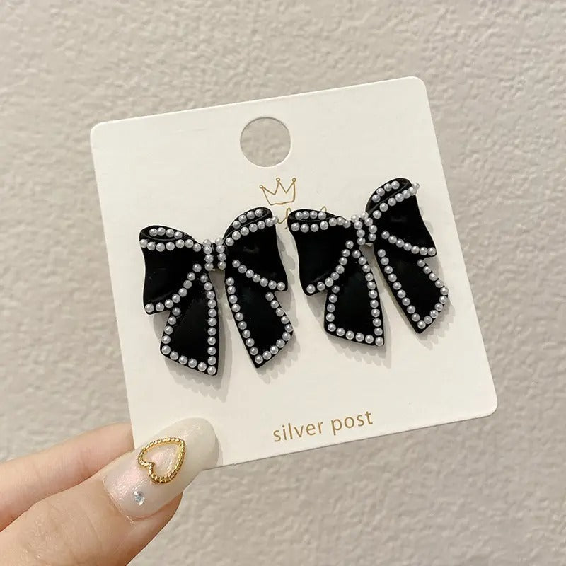 These black pearl bow knot stud earrings combine timeless elegance with a sophisticated design. Featuring lustrous black pearls delicately set within a graceful bow knot motif, they offer a refined accessory suitable for both formal occasions and everyday wear. Expertly crafted to enhance your style with subtle charm and enduring quality.